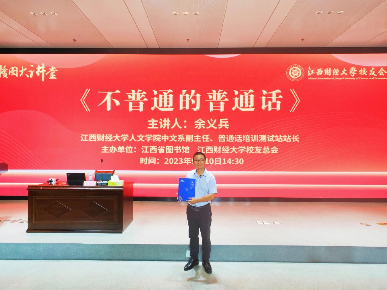 9月10日下午,我校人文学院中文系副主任、普通话培训测试站站长余义兵博士做客“赣图大讲堂”,在省图书馆鹅湖厅开展了“不普通的普通话”专题讲座。