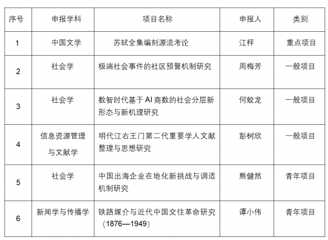 近日,全国哲学社会科学办公室正式公布了2025年度国家社会科学基金立项名单,我院表现突出,立项数量再创新高,共获批立项6项国家社科基金课题,含重点项目1项,一般项目3项,青年项目2项,涵盖社会学、中国文学、新闻学与传播学、信息资源管理与文献学等多个学科领域,覆盖了学院主要的学科专业,相关选题既体现了学院在传统学术领域的深厚积淀,也凸显了青年学者在数字化、国际化等新兴交叉领域的创新探索活力。