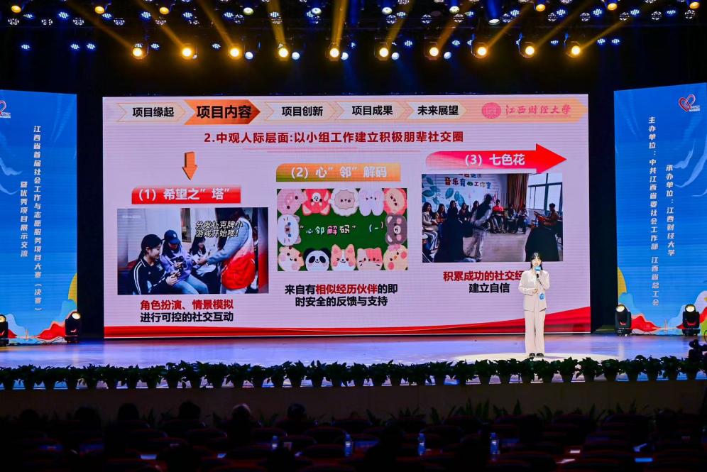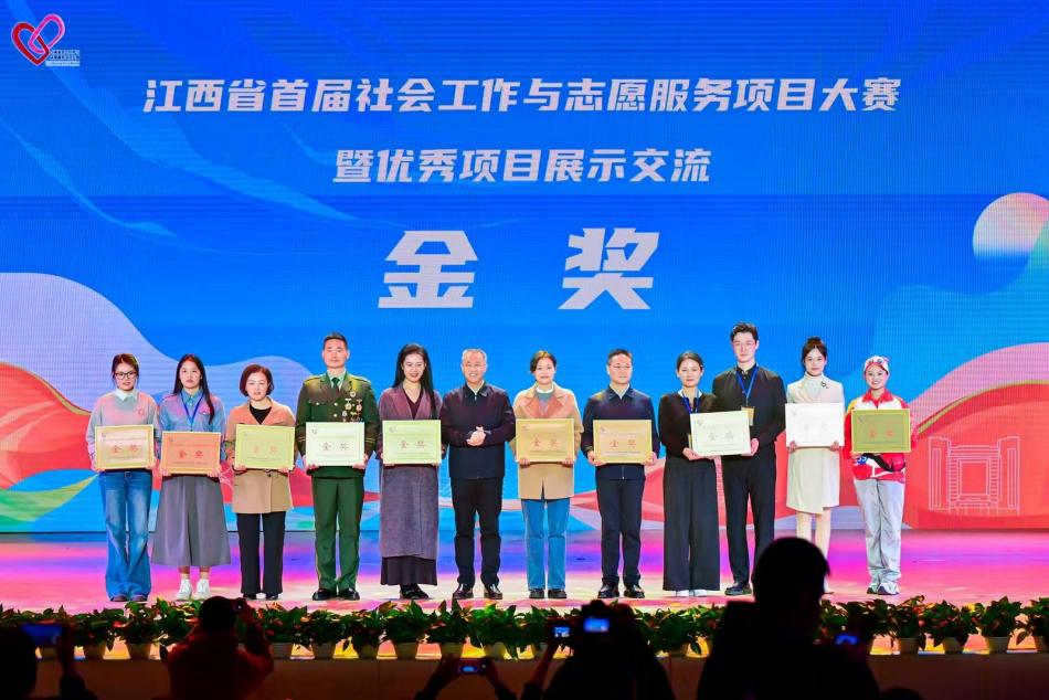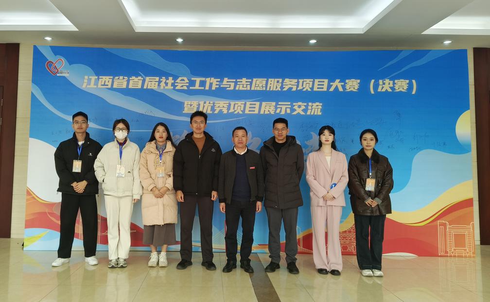 2025年12月4日,江西省首届社会工作与志愿服务大赛决赛在江西财经大学圆满落幕。我校《社交“解忧站”:高校学校社会工作社交赋能实践项目》团队在汪鸿波和殷微微两位老师的悉心指导下,余小莉、李金鑫、黄彦婷、程心媛、李甜、李炜、顾佳荟凭借扎实的实践成果、创新的服务模式与突出的专业能力脱颖而出,成功斩获金奖。