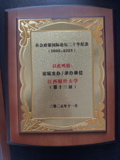 Markingthe 20th anniversary of the International Forum on Social Policy, aspecial commemorative ceremony was held. Professor Guan Xinping, theformer Chairman of the Social Policy Research Committee of theChinese Sociological Association, Researcher Yang Tuan, the formerChairman of the Social Policy Research Committee of the ChineseSociological Association, and the Secretary-General Fang Lijie of theSocial Policy Research Committee of the Chinese SociologicalAssociation presented commemorative plaques to universities andresearch institutions that had hosted/organized the InternationalForum on Social Policy over the past 20 years. Professor Hong Luminaccepted the commemorative plaque on behalf of JUFE (host of the 13thforum).