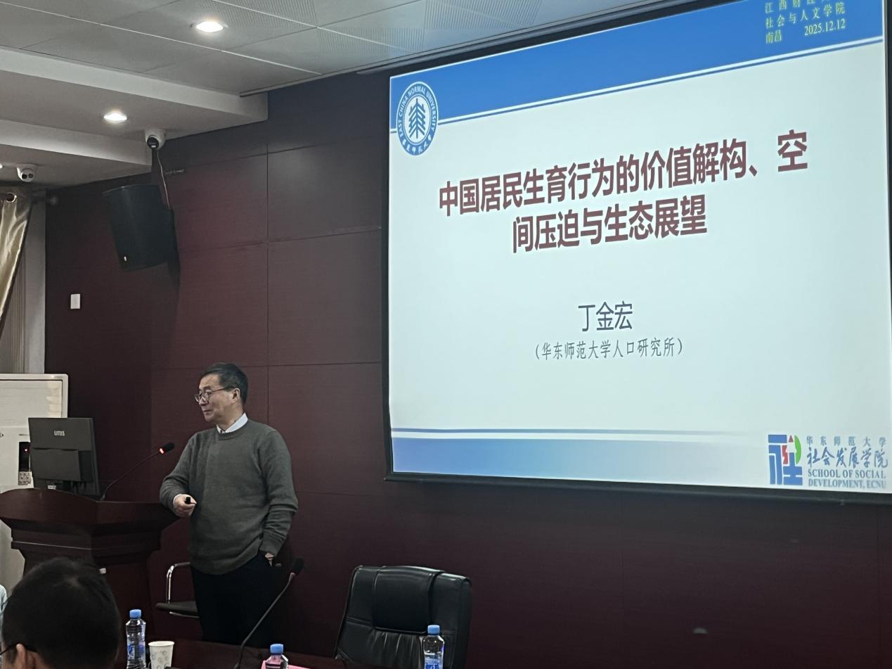 2025年12月12日下午,江西财经大学社会与人文学院特邀中国人口学会副会长、华东师范大学人口研究所丁金宏教授,带来“中国居民生育行为的价值解构、空间压迫与生态展望”专题讲座。全院百余名师生齐聚一堂,共赴这场融汇学理洞见与现实关照的学术盛宴。本次讲座由社会与人文学院尹忠海教授主持。