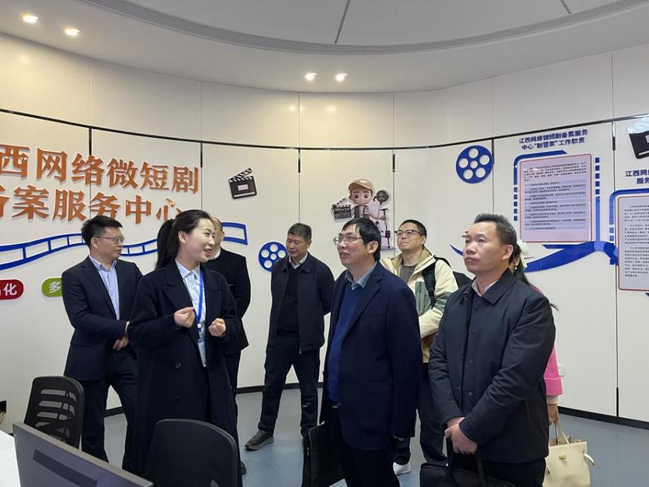 调研组随后走访了江西网络微短剧备案服务中心和江西网络微短剧版权快维中心。备案服务中心位于赣江新区市民服务中心一楼,成立于2024年6月24日,由江西省广播电视局、江西省政务服务管理办公室、江西广播电视台(集团)和江西师范大学共建,致力于探索微短剧精品化发展新路径,创新推出“3+5”服务模式——规划备案初审3个工作日、成片预审5个工作日,并建立专职“剧管家”服务队伍,为微短剧企业提供从立项、编剧、备案、拍摄到送审的全流程定制化服务。版权快维中心则建立了微短剧版权维权受理、举证核查、综合调解、行政保护、司法诉讼等于一体的一站式保护体系,创新推出“2小时内发送《侵权预警函》、48小时内达成调解”的快速处置机制,目前共有调解员20名,涵盖版权管理部门工作人员、法官、仲裁员、律师、高校教师、专家学者等。