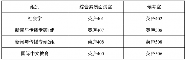 4月4日下午14:30,社会学硕士、国际中文教育专硕、新闻与传播专硕分组进行综合素质面试。面试教室及候考室安排如下: